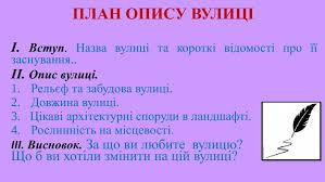 Урок 57. РМ №13. Усний твір-опис місцевості (вулиці, села, міста) на основі особистих спостережень і вражень у художньому стилі (за планом).